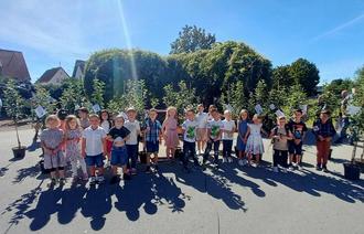 Der Apfelbaum zum Schulanfang – mittlerweile ein schöner Brauch. Auch in diesem Jahr haben die beiden Obst- und Gartenbauvereine Rehlingen und Fremersdorf – unterstützt durch den Schulförderverein der Grundschule Rehlingen – den neuen ABC-Schützen an unserer Grundschule einen Apfelbaum geschenkt. Insgesamt 54 Obstbäume wurden an die Kinder aus Eimersdorf, Fremersdorf und Rehlingen übergeben.