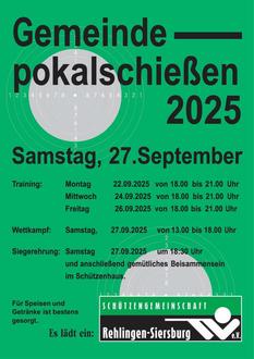 Einladung zum Gemeindepokalschießen vom 22.09.2025 bis 27.09.2025. Hallo werte Sportfreunde, wir möchten alle Ortsvereine, Firmen, Straßen- und Thekenmannschaften oder sonstige Gruppierungen zu unserem diesjährigen Gemeindepokalschießen um den Wanderpokal der Gemeinde Rehlingen-Siersburg recht herzlich in unser Schützenhaus in Rehlingen einladen.