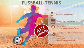 Am Tag der Deutschen Einheit findet wieder das traditionelle Fußballtennisturnier statt. Dieses Turnier markiert den Abschluss der Tennissaison und war in der Vergangenheit stets ein großes Highlight. Details sind dem Flyer zu entnehmen – wir empfehlen eine frühzeitige Anmeldung, da die Plätze limitiert und erfahrungsgemäß schnell vergeben sind.