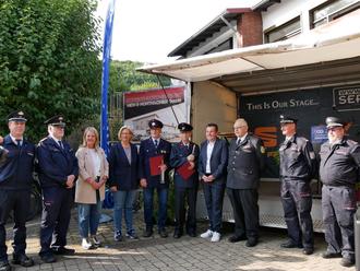 Wehrführer Daniel Schwartz, Kreisbrandinspekteur Bernd Paul, 1. Beigeordnete des Landkreises Saarlouis Sandra Quinten, Ministerpräsidentin Anke Rehlinger, die Jubilare Arno Folz und Alois Gerorge für 65 Jahre Feuerwehrdienst, Bürgermeister Joshua Pawlak, Vizepräsident des LFV Saarland Gerhard Sauer, stellvertretende Wehrführer Peter Mellinger und Martin Jacobs