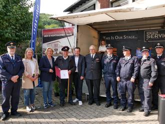 Kreisbrandinspekteur Bernd Paul, 1. Beigeordnete des Landkreises Saarlouis Sandra Quinten, Ministerpräsidentin Anke Rehlinger, der Jubilar Bartholomäus Esser für 70 Jahre Feuerwehrdienst, Bürgermeister Joshua Pawlak, Vizepräsident des LFV Saarland Gerhard Sauer, Wehrführer Daniel Schwartz, Löschbezirksführer Eimersdorf Benjamin Wolf, stellvertretende Wehrführer Martin Jacobs und Peter Mellinger