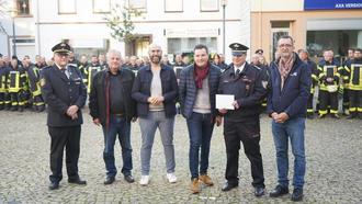 KBI, Beigeordneter Patrik Salzgeber, 1. Beigeordneter Maik Licher, Bürgermeister Joshua Pawlak, Wehrführer Heiko Augustin, Innenminister Reinhold Jost