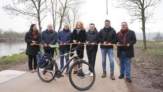 v.l.n.r. Martina Holzner (MdL), Walter Klein (Landkreis Saarlouis), Werner Nauerz (LfS-Direktor), Petra Berg (Ministerin), Joshua Pawlak (Bürgermeister Rehlingen-Siersburg), Christian Bies (Bürgermeister Kreisstadt Merzig) und Sebastian Schmitt (MdL) bei der Verkehrsfreigabe des Saar-Radwegs zwischen Fremersdorf und Merzig, MUKMAV/Kathrin Hinsberger