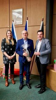 Im Namen der Verwaltung gratulierten Bürgermeister Joshua Pawlak (r) und Ulrike Barré (komm. Leitung Fachbereich 1, in dem die Sportförderung angesiedelt ist) Lutwin Jungmann recht herzlich.
