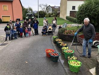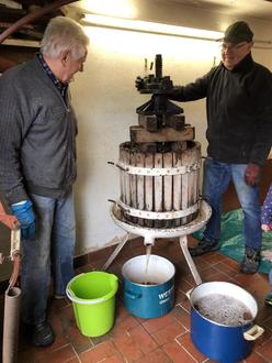 Fleißige kleine und große Hände sammelten am Samstag viele Äpfel, um gemeinsam mit Willi und Roman leckeren Apfelsaft daraus herzustellen. In Willis Garage standen die notwendigen Gerätschaften bereit und die Kinder verfolgten interessiert, wie die Äpfel zuerst kleingehäckselt und anschließend in der Kelter gepresst wurden. Der leckere Apfelsaft durfte natürlich sofort probiert und in Flaschen abgefüllt mit nach Hause genommen werden. Zusätzlich gab es feinen Kuchen und für die Erwachsenen Kaffee, bevor sich alle zufrieden auf den Heimweg machten.