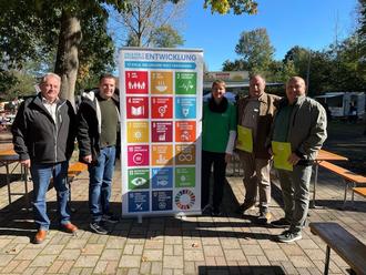 Beigeordneter Patrik Salzgeber, Bürgermeister Joshua Pawlak, Organisatorin Kirsten Dembowski, Naturschutzbeauftragter der Gemeinde Wilbert Hilt und Klimaschutzbeauftragter der Gemeinde Alexander Raphael präsentieren 17 Ziele für eine nachhaltige Entwicklung.