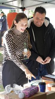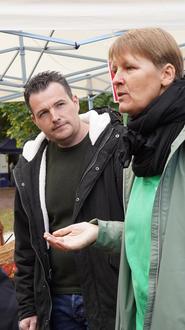 Julia Harenz (MdL) gemeinsam mit Bürgermeister Joshua Pawlak beim Quiz zu nachhaltigen Alternativen zu Verpackungs- und Plastikmüll am KlikKS-Stand.