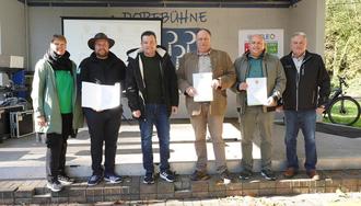 Das Kreistagsmitglied Rolf Klein (2.v.l.) und das Gemeinderatsmitglied Wilbert Hilt (3.v.r.) wurden zum Beauftragten des Bürgermeisters für Naturschutz bestellt, sowie das Gemeinderatsmitglied Alexander Raphael (2.v.r) zum Beauftragten des Bürgermeisters für Klimaschutz. Ebenfalls auf dem Bild die Organisatorin und Kliks Partin Kiki und Bürgermeister Joshua Pawlak mit seinem Stellvertreter Patrik Salzgeber