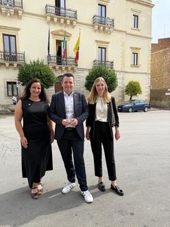 Bürgermeister Joshua Pawlak mit den beiden Kolleginnen Sabrina Di Gregorio und Annika Gehl vor dem Rathaus in Santa Caterina, nachdem beide die letzten Details zum Vertrag an diesem Morgen mit der Verwaltung in Santa Caterina abgestimmt hatten.