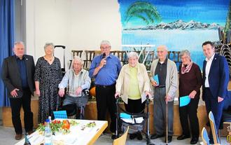 Die Geehrten des Seniorenheimes St. Antonius Edmund Günther und Theresia Broßette sowie die Geehrten Erich Mellinger und Silvia Mellinger mit dem Beigeordneten Patrik Salzgeber, der stellv. Ortsvorsteherin Margitta Schönberger, dem Ortsvorsteher Reiner Petry und Bürgermeister Joshua Pawlak.