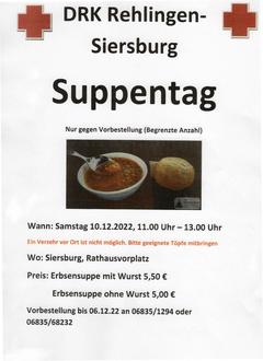 Am Samstag, dem 10.12.2022 bietet der DRK Ortsverein Rehlingen-Siersburg wieder seine leckere Erbsensuppe an.