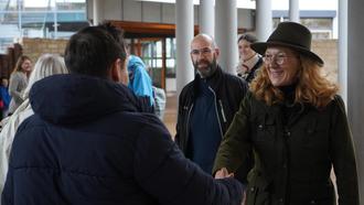 stellv. Ortsvorsteher Siersburg Kai Winter und 1. Beigeordneter Maik Licher bei der Begrüßung der Umweltministerin Petra Berg in der Grundschule Siersburg.