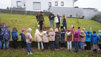 Baumpflanzung mit der Ministerin, dem 1. Beigeordneten, sowie Schüler*innen und Lehrer*innen der Grundschule.