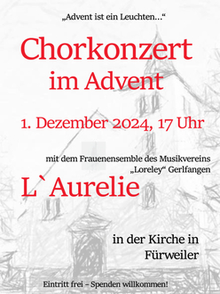 Wie im letzten Jahr veranstaltet das Frauenensemble L`Aurelie des Musikvereins Loreley Gerlfangen am ersten Advent ein Konzert in der Kirche in Fürweiler. Am 01.12.2024 um 17.00 Uhr werden adventliche, kirchliche und weltliche Stücke überwiegend a capella zu hören sein. Der Eintritt ist frei. Wir freuen uns auf viele Zuhörerinnen und Zuhörer.