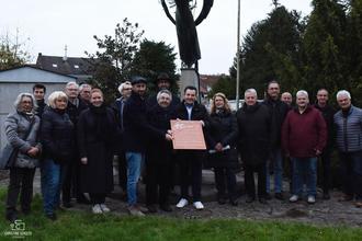 Unser Foto zeigt Bürgermeister a.D. Martin Silvanus (Mitte) bei der Überreichung der Informationstafel an Bürgermeister Joshua Pawlak (rechts) und Ortsvorsteher Sebastian Zimmer (links) mit Beigeordneten und Gemeinderatsmitgliedern sowie Ortsratsmitgliedern und Vereinsvertetern.