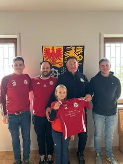 Trikotübergabe durch Heiko Alt an Greta Paulus im Beisein von Jugendleiter Dominik Paulus, Vors. Erik Schommer und 2. Vors. Florian Neu