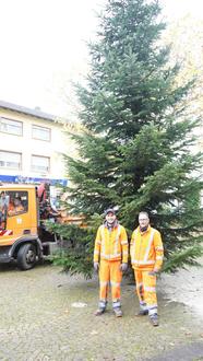 Jonas Huwig und Stefan Reget (Bauhof der Gemeinde Rehlingen-Siersburg) beim Aufstellen des Weihnachtsbaums vor dem Rathaus.