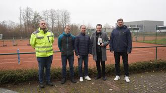 Tiefbauer der Gemeinde Rehlingen-Siersburg Florian Apitz (links) mit Bürgermeister Joshua Pawlak (2. von rechts) und dem Vorstand des TC Rehlingen beim Ortstermin.