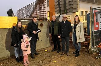 Die Maßnahme begann im August, als mit dem Abriss eines alten Gebäudes der Gemeinde der Startschuss für das Projekt erfolgte. Nun sind die Fundamentarbeiten abgeschlossen und der Bau hat bereits das Erdgeschoss erreicht. Dies war der perfekte Zeitpunkt um die Zeitkapsel mit einzubauen. Darin befinden sich ein aktuelles Amtsblatt der Gemeinde, ein Ausdruck des Bauantrags, Vorher-Fotos des Geländes mit dem Kindergarten.