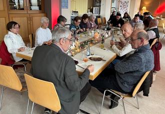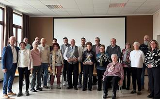 Die Geehrten Frau Helma Kreten und Herrn Maximilian Schöpp mit den anwesenden Senioren und Seniorinnen, dem Ortsrat, Ortsvorsteher Michael Engel, Bürgermeister Joshua Pawlak und Kreistagsmitglied Reiner Petry.