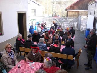 Etwa 35 Teilnehmer/innen zählte unsere Gruppe, die am Vormittag von Rosenmontag bei idealen Wetterbedingungen eine Wanderung von Siersburg nach Niedaltdorf unternahm. Zu einer Schnapsprobe mit kleinem Imbiss kehrten wir in der Brennerei Christian Schütz ein (unser Foto).