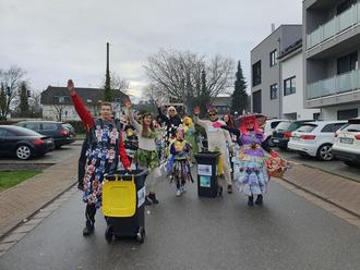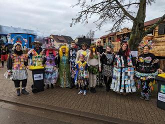 2023 wurde von der CleanUp Gruppe einige Tage nach dem Wasserhinkelumzug in Rehlingen Müll gesammelt und alle waren erschrocken, welche Müllmengen im Straßenrand, in den Vorgärten und Grünflächen landen. Daraus entstand die Motivation, in diesem Jahr selber mit dabei zu sein und mit guter Laune zu zeigen, dass man auch mit selbst gestalteten Kostümen aus Müll und Wurfmaterial, das kaum Müll produziert, jede Menge Spaß haben kann. Vielen Dank auch an Familie Zenner vom Marienhof in Gerlfangen für die Mandarinen-, Äpfel- und Nussspenden, die bei den Jecken am Straßenrand ebenso gut ankamen, wie die Taschenaschenbecher und Blumensamentüten.