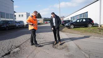 Besprechung der weiteren Vorgehensweise bei der Sanierung der Fahrbahnen: Tiefbauer Florian Apitz und Bürgermeister Joshua Pawlak im Industriegebiet Rehlingen
