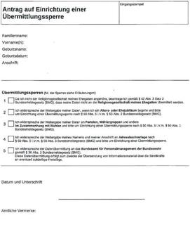 Für die Übersendung von Informationsmaterial übermittelt die Meldebehörde gemäß des § 58c Abs. 1 Soldatengesetz jährlich bis zum 31. März folgende Daten zu Personen an das Bundesamt für das Personalmanagement der Bundeswehr, die im Folgejahr volljährig werden: Familienname, Vorname, gegenwärtige Anschrift
