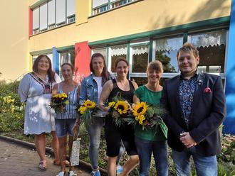 Gleich mit mehreren Blumensträußen durften die Leiterin der Kindertagestätte, Frau Urbano und ich als Bürgermeister Glückwünsche überbringen.