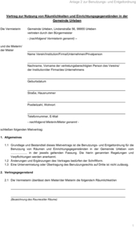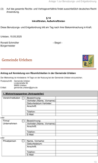 (3) Anträge auf Nutzung von Räumlichkeiten der Gemeinde Urleben sind an die Gemeinde Urleben, Lindenstraße 56, 99955 Urleben zu stellen. Für die Antragstellung ist der Vordruck der Anlage 1 zu verwenden. Die Anlage ist Bestandteil dieser Benutzungs- und Entgeltordnung.