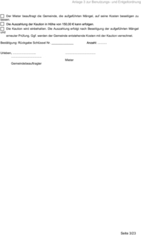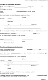 | f) | Die Räume dürfen für den Veranstaltungszweck erst hergerichtet werden, wenn sich der im Mietvertrag aufgeführte Vertragspartner im Beisein des Bürgermeisters bzw. eines von ihm Beauftragten von dem ordnungsgemäßen Zustand der Räumlichkeiten, Zufahrten, Zuwege und Parkplätze sowie der Vollzähligkeit der Einrichtungs- und Gebrauchsgegenstände überzeugt hat. Ein Übergabeprotokoll (Anlage 4) ist anzufertigen und von beiden Vertragsparteien zu unterschreiben. Sofern bis zum Beginn der Veranstaltung vom Nutzer keine Beanstandungen erhoben worden sind, gelten die zur Benutzung überlassenen Räumlichkeiten und Einrichtungen als vom Nutzer selbst im ordnungsgemäßen Zustand übernommen. |