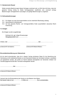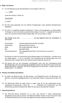 (6) Für den Mietvertrag ist der Mustervertrag (Anlage 2) zu dieser Benutzungs- und Entgeltordnung zu verwenden, soweit keine besondere Vereinbarung notwendig ist. Grundsätzlich wird diese Benutzungs- und Entgeltordnung mit Abschluss des Mietvertrages anerkannt. Die Mietverträge können zu den Sprechzeiten des Bürgermeisters oder nach Vereinbarung von den Gemeinderatsmitgliedern eingesehen werden.