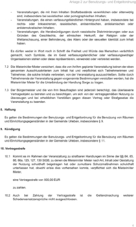 (5) Personen oder Vereinigungen, deren Zweck oder Tätigkeit den Strafgesetzen zuwiderlaufen oder die sich gegen die verfassungsmäßige Ordnung richten, sind von der Überlassung von Räumlichkeiten ausgeschlossen. Parteipolitische, konfessionelle oder weltanschauliche Propaganda sind in den Räumen untersagt.