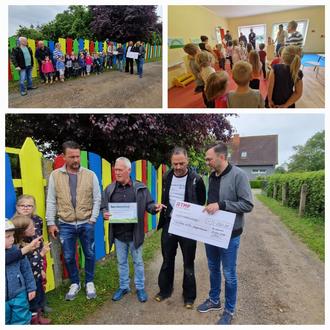 Doch eines war noch der Clou. Eines Morgens im April standen einige Männer an unserem alten Maschendrahtzaun. Was hatten die denn vor? Ihr glaubt es kaum. Die Angermäuse bekamen einen neuen Holzzaun. Die Freude war riesengroß. Wir trauten unseren Augen nicht, ein neuer Zaun, auf den wir schon so lange warteten. Unser Opa Detlef Schiller mobilisierte vier Firmen. Diese fertigten ihn an, bemalten ihn mit bunten Farben und haben das Ganze auch noch gesponsert. Das war kaum zu glauben, aber wahr. Darum muss das in die Zeitung und ihr alle, müsst das unbedingt lesen. Natürlich bedankten wir uns mit einem leckeren Frühstück und wir bekamen noch zwei Checks für unser neues Trampolin. Einfach wunderbar!!! Wir Angermäuse bedanken uns bei der Zimmerei Christoph Müller, bei Ausbauprofi Andre Bark, bei Andre Leffler TMP und Ralf Wende Kulusa GMbH.