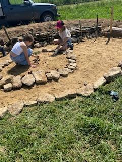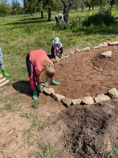 Zum Abschluss legten die Kinder Feldsteine um die Sandlinsen, um sie noch besser zu sichern. Mitgebrachte Zapfen und Stöcke wurden kunstvoll auf die Sandlinsen gelegt, sodass die Bauwerke lebendig und naturverbunden wirkten. Jetzt sollen sie als Lebensraum für Insekten und kleine Tiere dienen.