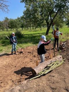 Die jungen Helfer wurden in Gruppen eingeteilt. Mit viel Eifer und Teamgeist schaufelten sie den Sand direkt in die vorbereiteten Gruben oder in die Schubkarren, die dann in den Gruben entleert wurden. Nach dem Befüllen wurde der Sand festgetreten, um stabile und langlebige Sandlinsen zu schaffen. Die Erdwälle rund um die Sandlinsen wurden mit Stöcken verkleidet, was den Bauwerken eine natürliche Optik verlieh und sie zusätzlich stabilisierte.
