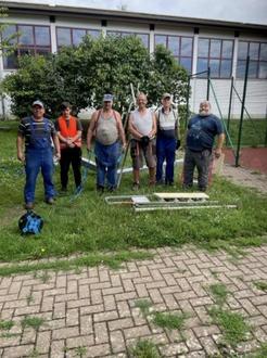 Die Gemeindearbeiter unter der Leitung von Hagen Schwarz und der Hausmeister der Schule stellten den Basketballkorb am Sportplatz der Schule auf.