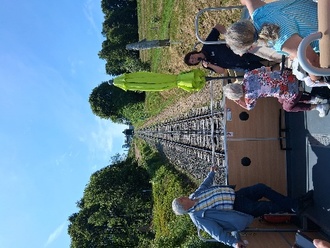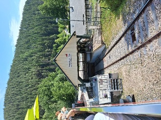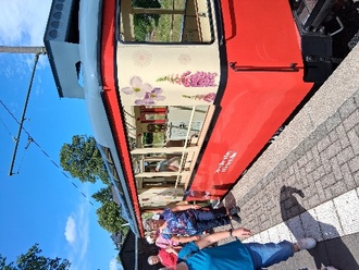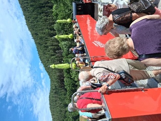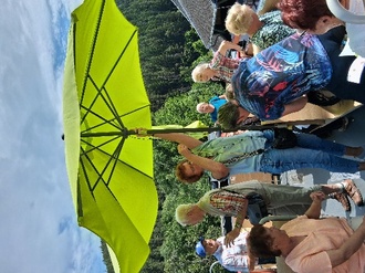 Nun sind wir zur Oberweißbacher Bergbahn gefahren. Hier konnten wir mit der Bergbahn im offenen Wagen zunächst bis nach Lichtenhain fahren. Nebenbei haben wir viel über die Bergbahn und die Gegend erfahren. Es war sehr warm, so dass wir die Sonnenschirme geöffnet haben.