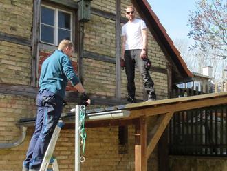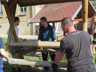 Der Erdhügel wurde abgetragen, das Spielhaus und die Waldschänke versetzt, die Spielgeräte mit dem Hochdruckreiniger gesäubert und die Lese- und Entspannungsecke bekam ein neues Dach.