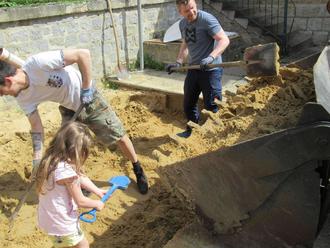 Dank eines Papas hat unsere große Sandkiste neuen Sand bekommen. Diesen hat die K+B Kies & Beton GmbH gesponsert. Vielen Dank dafür! Papas rückten mit Radlader, Bagger und Traktor an und schaufelten den Sand ruck zuck aus und schütteten den neuen Sand hinein. Auch einige Kinder halfen ganz nach dem Motto „Viele Hände, schnelles Ende“ fleißig mit.