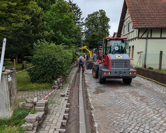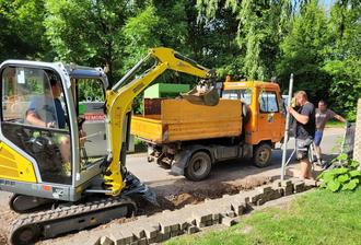 da der Mittelweg durch den Umleitungsverkehr im Zuge der Bauarbeiten in der Hauptstraße beschädigt wurde, steht in den nächsten Wochen eine Teilsanierung der Straßenoberfläche an. Da die Bordanlagen in einem schlechten Zustand waren, haben wir uns entschieden, diese in den Teilbereichen, in denen die Sanierung erfolgt, zu erneuern. Erfreulicherweise haben sich engagierte Bürger bereit erklärt, diese Baumaßnahme mit ihrer Arbeitsleistung und Expertise zu unterstützen. In einem Arbeitseinsatz bei sommerlich heißen Temperaturen wurde zunächst die bisherige Bordanlage abgebrochen, in einen bereitgestellten Container verladen und parallel die Vorbereitungen für die neuen Borde getroffen. In einem weiteren Arbeitseinsatz wurden dann bei zunächst regnerischen Bedingungen die neuen Straßenborde in Beton gesetzt und mit der nötigen Rückenstütze versehen.