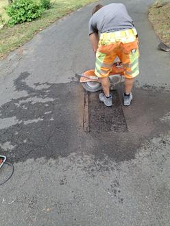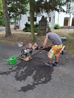 die Straße rund um das Kulturhaus hat in den vergangenen Jahren, insbesondere in der unteren Kurve, Risse bekommen. Auch sind bereits Fahrrinnen erkennbar. Ein Teil mit einer aufgebrochenen Asphaltoberfläche wurde nun im Rahmen eines Arbeitseinsatzes repariert. Thomas Harant und James Balsing haben den Bereich zunächst eingeschnitten, ausgestemmt, mit frischem Asphalt gefüllt und verdichtet. Dafür möchte ich mich ausdrücklich bedanken und freue mich, dass die beiden sich erneut tatkräftig für unseren Ort einsetzen.