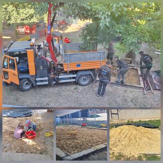 Die jetzt prall gefüllten vier Sandkisten laden wieder zum Buddeln und Sandburgen bauen ein. Das Stadtarbeiter-Team um Pascal Dünnebeil verteilte den riesigen Sandhaufen anschließend auf alle Sandkisten.
