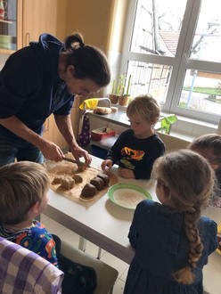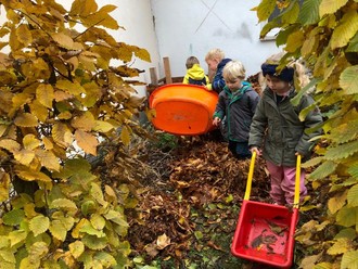 Zurück in unserer Einrichtung wird der Herd in der Küche angeheizt. So wurden kurzerhand frische Äpfel gepflückt, um eigenen Apfelmus her zu stellen oder Holunder für lecker Sirup geerntet. Beim Thema Igel darf natürlich ein selbstgebackenes Igelbrötchen nicht fehlen.