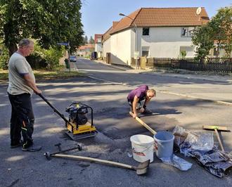 das Schlagloch auf dem Parkplatz am Ortseingang aus Richtung Bad Tennstedt hatte sich in den letzten Monaten vergrößert, sodass hier Handlungsbedarf bestand. Im September haben Thomas Harant und James Balsing in einem Arbeitseinsatz den Bereich zunächst eingeschnitten, ausgestemmt und anschließend mit frischem Asphalt gefüllt und verdichtet.