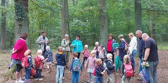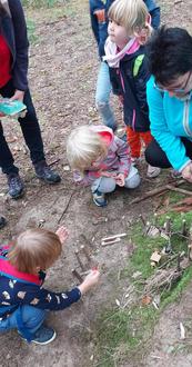 Die Großeltern versammelten sich nach dem Frühstück im Garten. Mit dem Morgengruß aus dem Qigong fanden wir einen gemeinsamen entspannten Einstieg in den Tag. Danach bekam jedes Großeltern-Kind-Team eine gestaltete Eierpappe für das Waldmemory. Während der gesamten Wanderung konnten Steine, Zapfen, Eicheln, Schneckenhäuser, Blätter, Blüten etc. gesammelt werden. Mit Wanderschuhen und Rucksäcken ging es zur Männertagswiese los. Auf dem Weg in den Wald gab es zwischendurch einzelne Stationen der Sinne. So konnten Zapfen, Laub, Nüsse usw. in Fühlsäckchen ertastet werden. Später wurde der Geruchssinn getestet. In kleinen Riecheiern konnte Zimt, Lavendel, Thymian, Minze etc. gerochen werden.