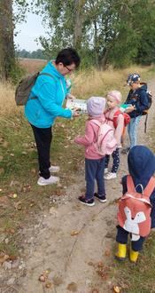 Leider bekamen wir auch eine Regendusche vom Himmel ab. Wir stellten uns unter Bäumen und Sträuchern unter. Zum Glück bietet der Wald Schutz. Während unserer Wanderung sahen wir auch Rehe auf dem Feld und beobachteten die fleißigen Bauern bei ihrer Feldarbeit. Nebenbei sammelten wir liegen gelassenen oder weggeworfenen Müll, sogar Trinkgläser, auf und entsorgten den Müll später in den Mülltonnen unseres Kindergartens. Das Thema Nachhaltigkeit ist in unserer Einrichtung stets präsent.