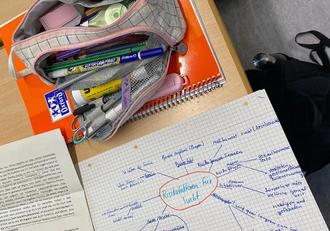 Darauf aufbauend arbeiteten die Klassen methodisch in Kleingruppen. Diskutiert wurden Themen wie Suchtursachen und -auslöser, Internetsucht oder auch die Interpretation von Figuren aus dem Theaterstück. Die Ergebnisse wurden anschließend im Plenum vorgestellt. Um auch die kreative Seite der Jugendlichen einzubinden, gestalteten sie im weiteren Verlauf Journale und Beutel, die einen künstlerischen Bezug zur Präventionsthematik aufnahmen. Außerdem verfassten sie in einem Gedankenspiel Briefe an ihr zukünftiges Ich. Abgeschlossen wurden die Projekttage jeweils mit einem digitalen Quiz im Format „Kahoot“, bei dem das neu erworbene Wissen spielerisch angewendet wurde.