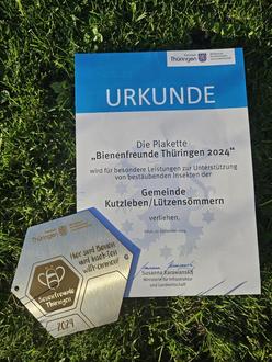 All die Bemühungen um unsere Blühstreifen, Bienenhotels und Insektenschutz wurden von der Landesregierung honoriert! Unsere Gemeinde wurde von der Ministerin Susanna Karawanskiy mit der Plakette "Bienenfreunde 2024" für besondere Leistungen und Unterstützung von bestäubenden Insekten ausgezeichnet.