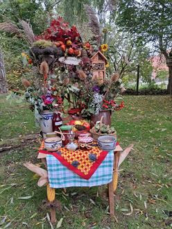 Nach diesen Ausflügen in Natur und Geschichte begannen die Vorbereitungen für unser Öbsterfest bzw. Herbstmarkt (18.10.2025). Bereits im Vorfeld wurden die ersten herbstlich dekorierten Stühle aufgestellt und zwei Gruppen des hiesigen Kindergartens erkundeten am Mittwoch und Donnerstag zuvor spielerisch das Ausstellungsgelände im Gutshof.